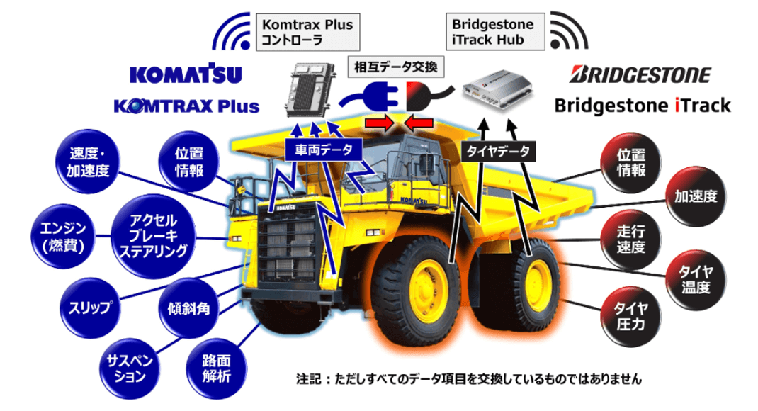 2025年、コマツとブリヂストンは、鉱山事業者様への新たなソリューションサービスを提供する共創プロジェクトの実証実験を開始しました。コマツの鉱山向け大型機械の管理システム「Komtrax Plus」※1から得られる車両データと、ブリヂストンの鉱山車両向け次世代タイヤモニタリングシステム「Bridgestone iTrack」※2から得られるタイヤデータをリアルタイムで共有・解析し、タイヤの適切な使い方を提案することで、鉱山向けダンプトラックの燃費改善やタイヤをより安全に、長く、上手く、効率的に使い切っていただくことを目指します。両社は今後この実証実験の結果をもとに、各社単独では成し得なかったサービスの提供を開始する予定です。