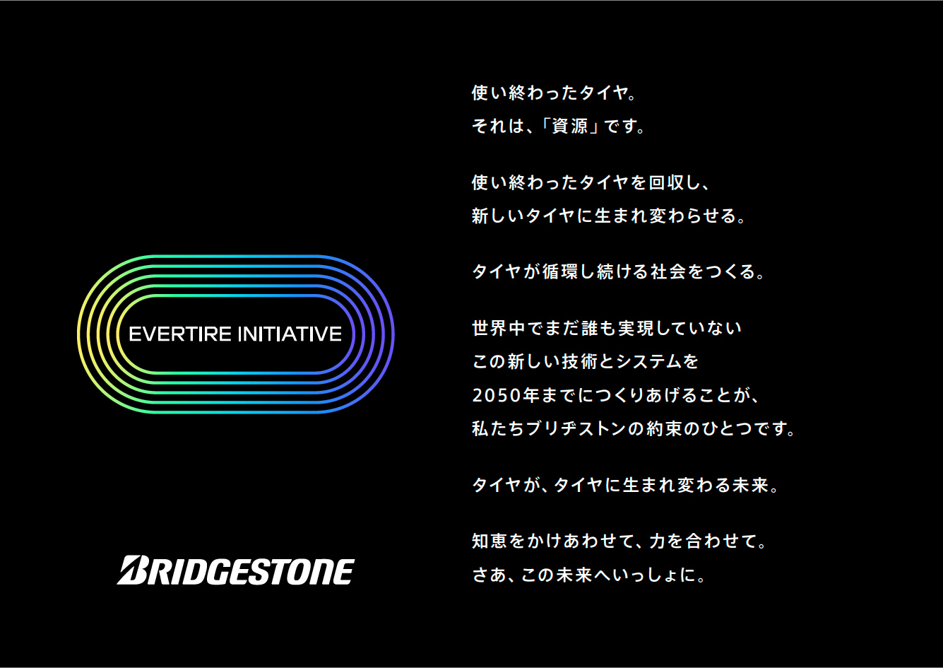 ブリヂストンは、使い終わったタイヤを「廃タイヤ」や「エンドオブライフタイヤ」としてではなく、ゴムや原材料に戻し“EVER”な(常に・ずっと・永遠に続く)タイヤとして循環させていく、タイヤがタイヤに生まれ変わる未来に向けた活動「EVERTIRE INITIATIVE」を2022年にスタートしました。この「EVERTIRE INITIATIVE」のもと、使い終わったタイヤがタイヤの原材料として再生され循環する社会の実現を目指して、パートナーの皆様と共にリサイクル事業の取り組みを拡大・加速していきます。