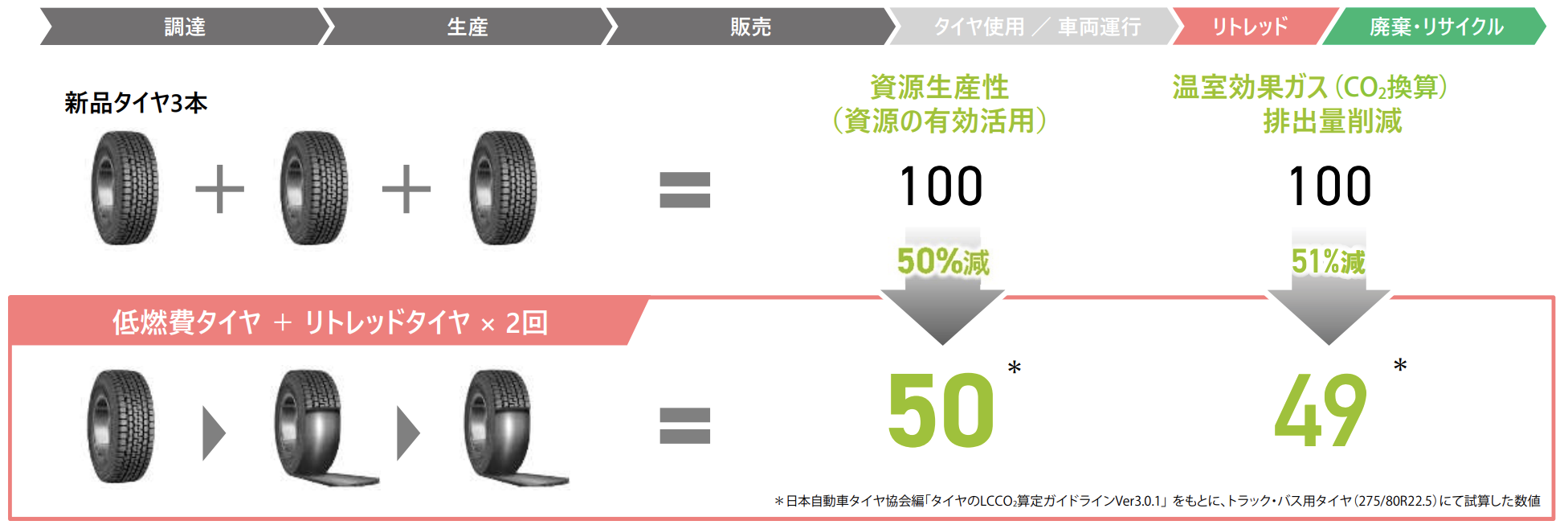 ブリヂストンでは、お客様が使用されたタイヤのすり減った表面(トレッド)部分を貼り替え、再び使用可能となったタイヤをお届けするリトレッドソリューションをグローバルで展開しています。リトレッドタイヤは、原材料使用量の削減による資源生産性の向上や、CO2排出量の削減に貢献します。お客様に当社のタイヤを3回使用いただく前提で、新品タイヤを3本使用した場合と、新品低燃費タイヤ1本を2回リトレッドして使用した場合を比較すると、リトレッドでは、お客様の使用段階を除くライフサイクル全体での使用原材料量及びCO2排出量を半減できます。グループ独自の技術に基づく複数回のリトレッドと、「断トツ商品」、適切なメンテナンスを組み合わせたソリューションの提供により、ブリヂストンはタイヤの資産価値を最大限に活用するとともに、お客様の安全性、コスト効率、生産性、環境性といった社会価値・顧客価値を提供していきます。