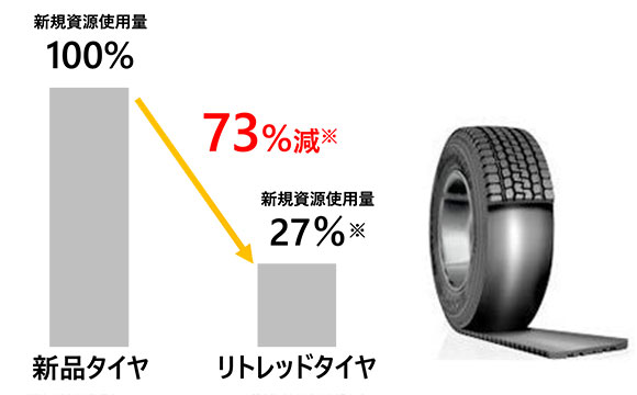 すり減ったタイヤのトレッドゴム(路面と接する部分)を貼り替えて、使用済タイヤを再利用するリトレッドタイヤは、新品タイヤに比べて、原材料使用量が3分の1未満になるだけでなく、トレッドゴム以外の部材(台タイヤ)を再利用できるため、廃タイヤの削減にも大きく貢献します。廃棄されるタイヤを減らすことで、社会における廃棄物の削減に寄与しています。