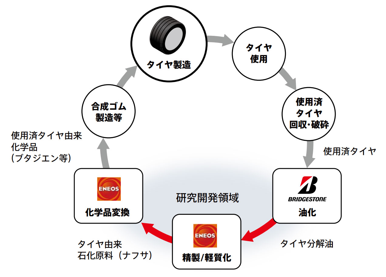 本プロジェクトでは、使用済タイヤを精密熱分解して得られる分解油をリサイクルオイル(ナフサ等)化し、このオイルから合成ゴムの素原料であるブタジエンなどの化学品を高収率に製造するケミカルリサイクル技術の社会実装に向けた実証実験を行います。2030年までに量産を想定した大規模実証試験を実施し、その後、早期の事業化を進めていきます。当社がタイヤ・ゴム事業を通じて培ってきた高機能ゴムなどの高分子素材の設計技術と、ENEOSが有する原油精製技術や基礎化学品製造に関する基盤技術を最大限融合させ、タイヤ・ゴム産業及び石油・石油化学産業のバリューチェーンにおけるさらなる資源循環性の向上やCO2排出量の削減に取り組みます。