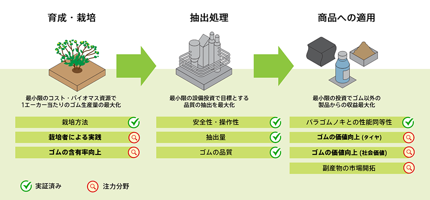 新しい資源であるグアユールには、新たな栽培、収穫、加工のプロセスが必要です。ブリヂストンは、すでに1エーカー(約4,000m2)当たりのゴム生産量を最大化する栽培方法を確立し、ゴムの抽出プロセスの実証に成功しています。また、グアユールから抽出されるゴム以外の副産物についても、市場における潜在的なニーズ・用途を確認しています。