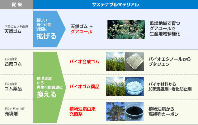 ブリヂストンは、天然ゴムの供給源・生産地域を多様化するとともに、原材料として使用する再生資源・再生可能資源を拡充しています。産学連携の取り組みなどを効果的に行いながら、「天然ゴム」や「有機繊維」は新しい再生可能資源に、「合成ゴム」や「カーボン」、「ゴム薬品」などは石油由来の資源から再生可能資源に換える取り組みを進めています。今後も、研究開発体制の確立や基盤技術の開発、量産化の検討を進めていきます。