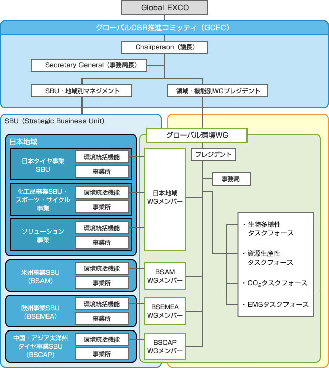 ブリヂストングループでは、中期経営計画に沿ってTEAMSの活動を強化するために、グローバルサステナビリティコミッティとグローバル環境ワーキンググループ(WG)、戦略的事業ユニット(SBU)の3つの組織が調整・協力していく体制をとっています。グループ全体の環境戦略や方針は、グローバル経営執行会議(Global EXCO)の監督のもと、グローバル環境WGとグローバルサステナビリティコミッティが策定します。承認された戦略や方針は、各SBUが環境マネジメントシステム(EMS)を通して実践します。