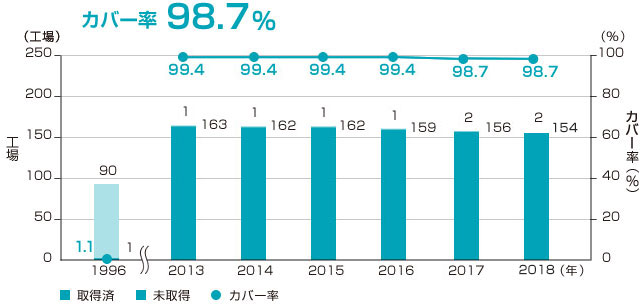 ブリヂストングループでは、50人以上の従業員が働く全ての生産拠点を対象として、ISO14001環境マネジメントシステム認証の取得を義務付けています。ISO14001認証の取得を通じて、事業の環境への影響を最小化し、関連する環境法令の遵守に継続的に取り組む仕組みを整備しており、2020年末時点で取得対象の153生産拠点の内、150の拠点(98.0%)がISO14001認証を取得しています。