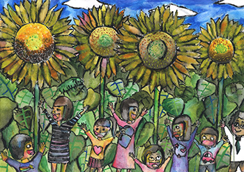 ひまわりは、太陽みたいです。みんなに、生きる力を与えます。私は、ひまわり畑をみると、たくさんの元気をもらえます。ひまわり畑があれば、笑顔花咲く世界になると考えます。一番大切な大自然だから絵にしました。