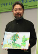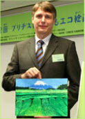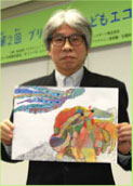 まず全体的な印象ですけれども皆さんの表現の仕方が非常に優れているので大変感心致しました。この中から一枚だけ選ぶというのは大変難しく、気に入ったものが3枚から4枚ほどありました。最終的にこの「茶畑と富士山~わたしのまどから~」を私が選んだ理由は三つあります。第一は私自身が富士山を大変好きであるということ。第二に色の組み合わせです。ブルーから白、グリーンそしてそこに少し赤が組み合わさっているというそのコンビネーションが非常にぴったりとしていて素晴らしいと思いました。そして、第三に、10歳というこの年齢にして非常に写実的な描き方というのを身に付けている、また細部に目を向けてみますとその雲の描き方なども、もう既にアートと呼べる水準に達しているということです。