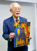 12歳というと、大人のものの見方や表現に突入する年齢ですが、この1点は非常に色彩が鮮やかで、色彩を対比させて使っています。派手な色彩とそれを抑える黒っぽい画面の処理。驚くほど上手な絵です。手に取り上げて何度もどういう手法で描いていったのか、自問自答しました。とても落ち着いているけれども、非常に上手な表現で、色彩の使い方が際立っていたので、選びました。