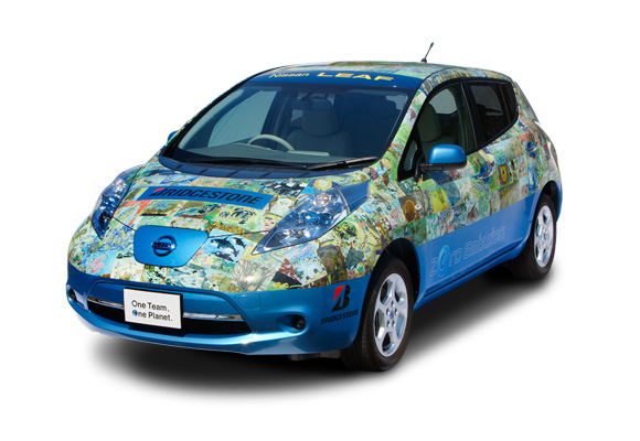 地球に優しい100%電気自動車「日産リーフ」に受賞作品101点をデザインした「9代目エコカー」をご紹介しています。 ※リーフは、日産自動車株式会社の電気自動車です。 ブリヂストンは地球にやさしいクルマ社会の実現をめざして、エコカーへの理解を広める活動を行っています。