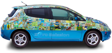 地球に優しい100%電機自動車「日産リーフ」に受賞作品101点をデザインした「9代目エコカー」をご紹介しています。