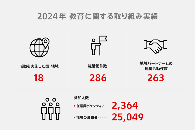 2024年は、18の国と地域で286件※1の教育に関する取り組み(うち263件は外部パートナーと連携※2、2,364人の従業員ボランティアが参加※3)を25,049人の地域の方々に対して実施※4しました。
