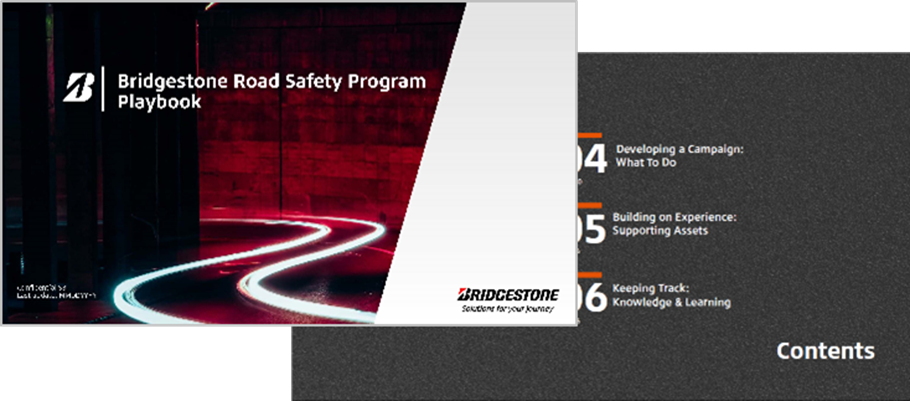 これらの取り組みからさらなるシナジーを創出するため、2023年、ブリヂストンは交通安全活動を推進する国際NPO、Global Road Safety Partnership(GRSP)と協力して、グローバルで相乗効果を生み出すプログラム「ブリヂストン交通安全プログラム(BRSP)」を開始したほか、社内向けガイドを作成し、「Life is a journey. Let’s make it a safe one.(人生は旅。安全な旅にしよう。)」という交通安全に関するスローガンのもと、GRSPとの連携をさらに強化しています。