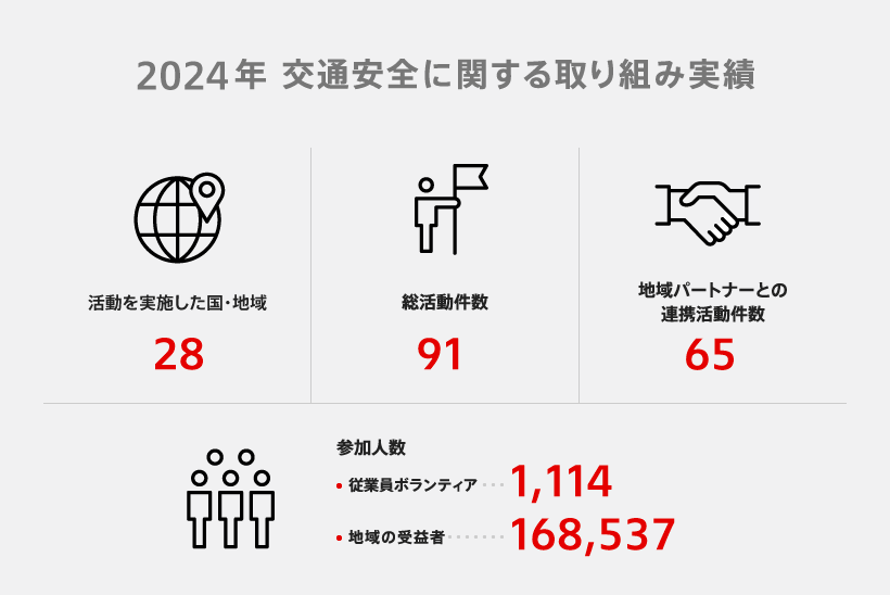 2024年は、28の国・地域で91件※2の交通安全に関する取り組み(うち65件は外部パートナーと連携※3、1,114人の従業員ボランティアが参加※4)を168,537人の地域の方々に対して実施※5しました。2024年にはGRSPとの協力のもと、8つの交通安全活動を取り上げて指標を設定し、活動のインパクトの評価を実施しました。
