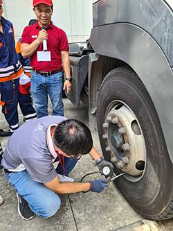 このプログラムの目的は、タイヤの空気圧の点検や偏摩耗の特定、摩耗の原因の理解といった、タイヤ管理の基本的な手法をトラックドライバーに教え、スキルを身に付けてもらうことです。研修は3回のセッションに分けて行われました。2024年12月9日と16日に慶尚南道にあるトラック・バス・ラジアルタイヤファミリーチャネル(TBR FC)販売店近くで開催された研修では、交通安全やタイヤのメンテナンスに関するテーマを取り上げました。