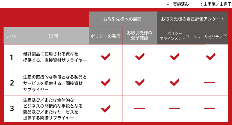 お取引先様と共に調達ポリシーをサプライチェーン全体に浸透させていくことを目標に、 ブリヂストンのレベル1及び2の全てのお取引先様に受領確認をお願いしています。2018年の初版においては、99%を超えるレベル1及び2のお取引先様に調達ポリシーを受領いただいたことを確認しています。第3版を2024年1月に改訂・発行し、レベル1及び2の全てのお取引先様からの受領確認を目標にしています。(2025年3月末時点では、74%のレベル1及び2のお取引先様から調達ポリシーの受領書をいただいています。)