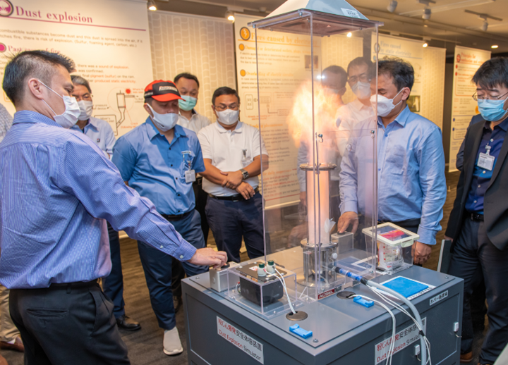 「グローバル防災センター」では、2003年9月8日に発生したブリヂストン栃木工場の火災など、忘れてはならない防災事故の原因を振り返る教育・研修を行っています。同センターでは、過去の火災について語り合い、一人ひとりの心に刻み込む研修や、静電気による粉じん爆発を従業員が体感することができる体感機を使用して、火災の危険への認識を高め行動につなげる研修など、多様な研修を実施しています。また、火災現場の残存機器や設備の模型を用いて火災の恐ろしさを伝え、災害の予防と早期発見につなげる研修も行っています。さらに、国内だけでなく海外で発生した火災の事例も紹介し、国際的な体験型の研修環境を提供しています。