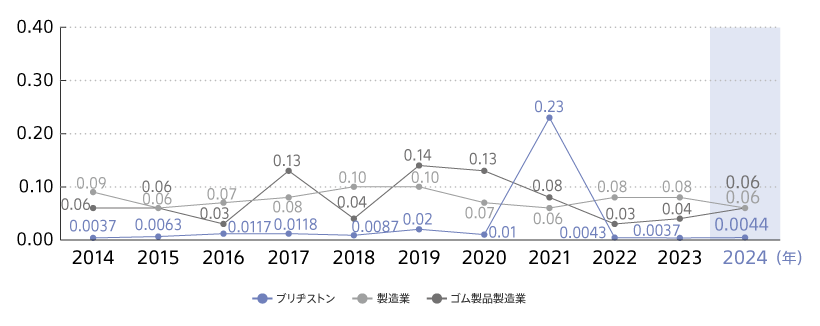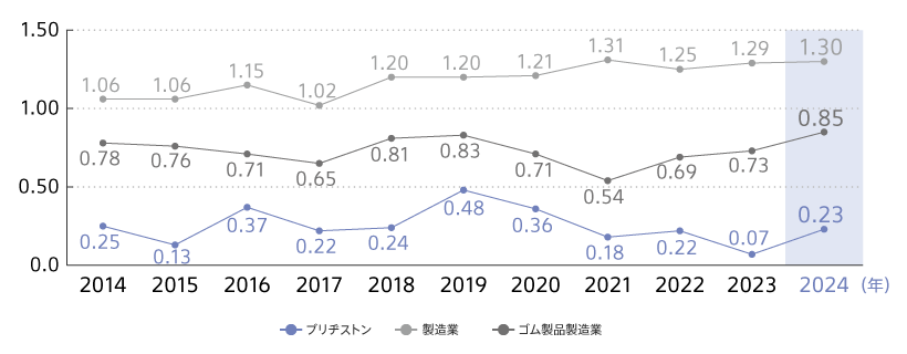 - ※5米国のゴム製品製造業の休業度数率は、100万延実労働時間当たり4.0(アメリカ合衆国労働統計局 2023年)