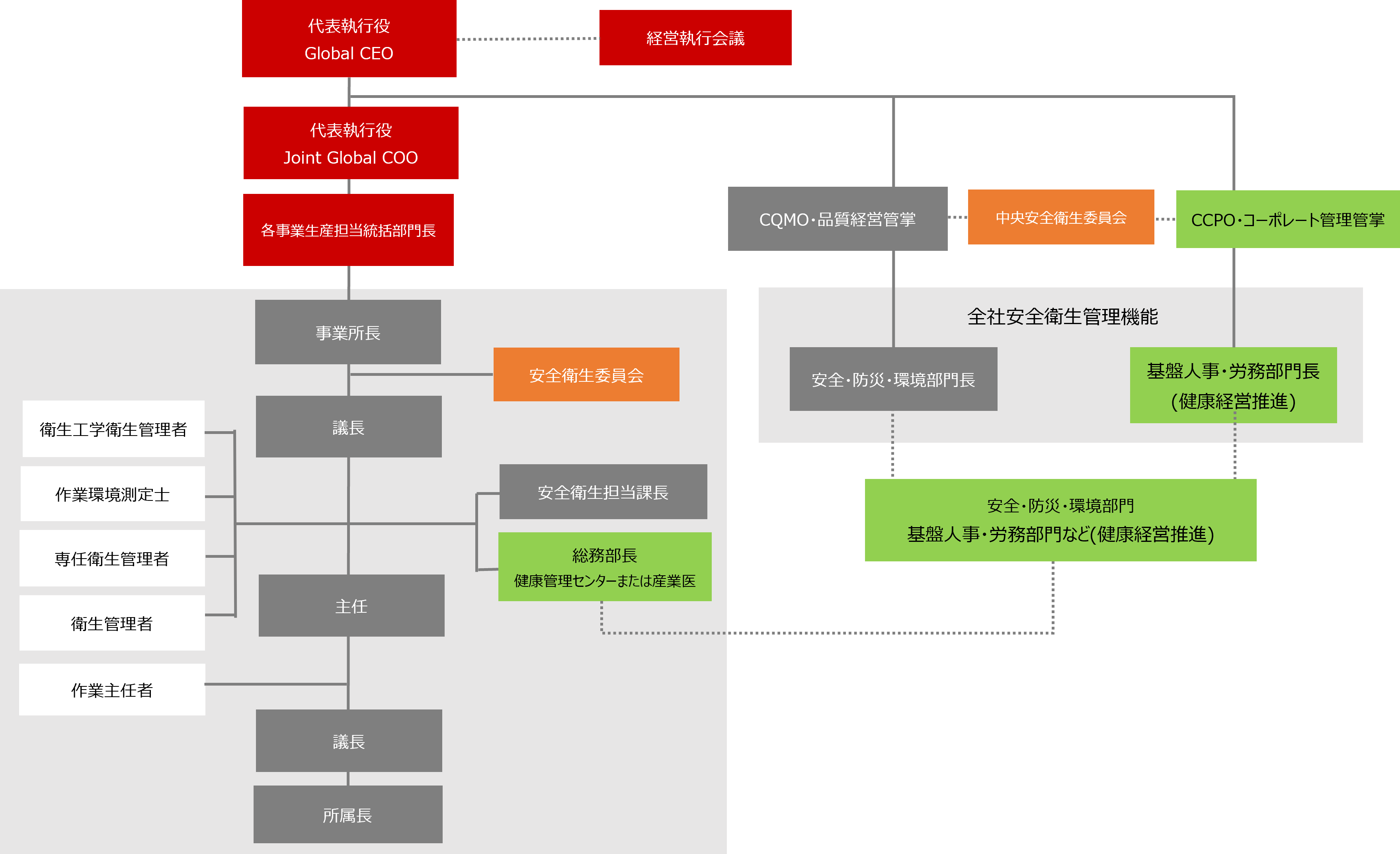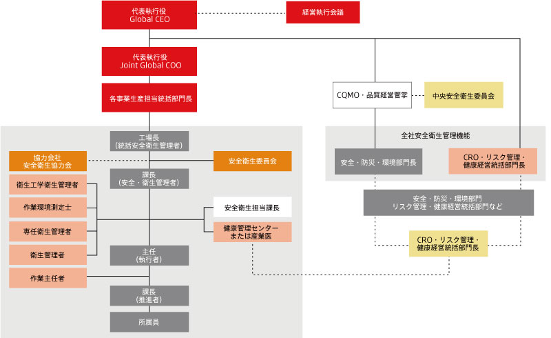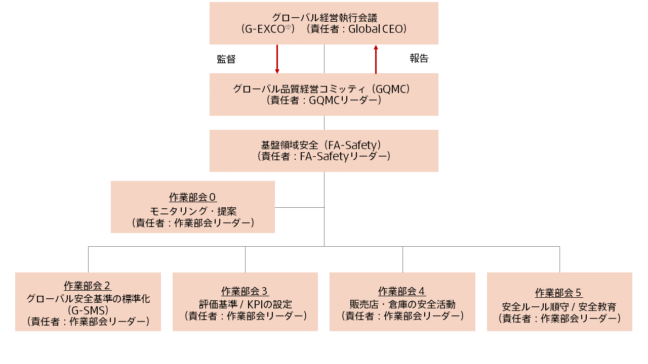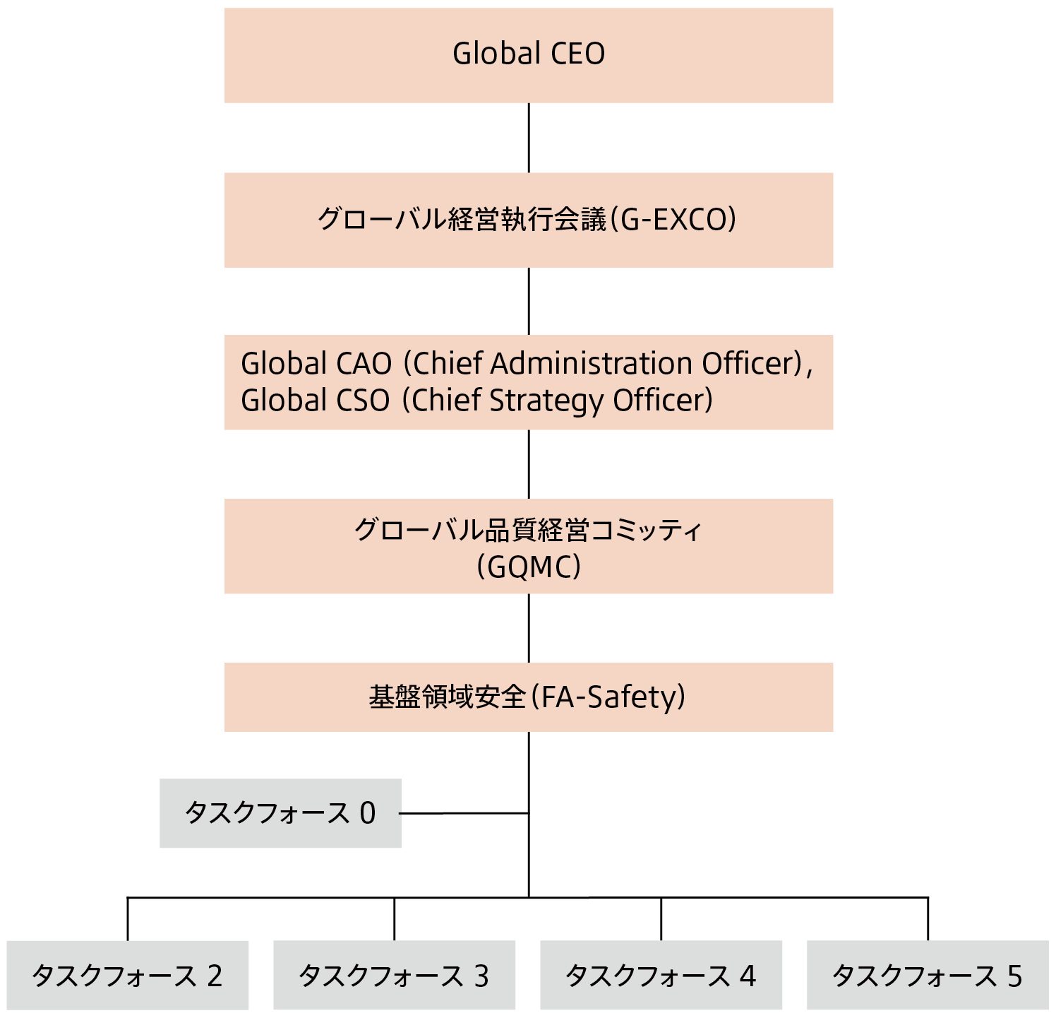 Global CTOおよびGlobal CAO・Global CSOを含むグローバル経営執行会議(Global EXCO)のメンバーによる統括のもと、GQMC傘下の基盤領域安全グループは、安全衛生に関するグローバルなリスクや課題・機会を管理し、対応を行っています。