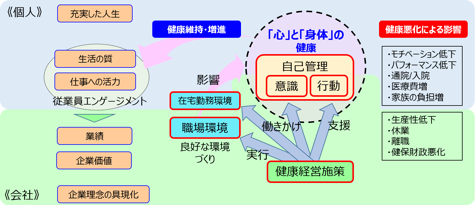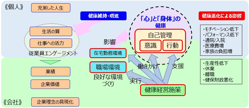 健康経営方針は、個人の充実した人生と、会社の企業理念それぞれを実現するための方針です。