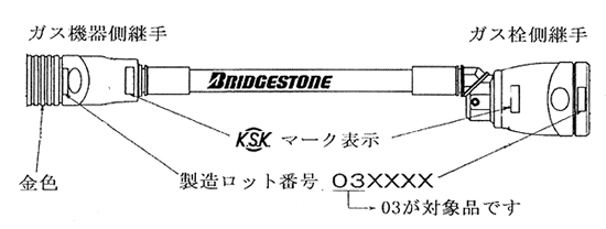 つきましては、お手持ちのガスコードの継手部・ホース本体部をご確認のうえ、該当製品の場合には、下記のお問い合せ先までご連絡下さいますよう、お願い申し上げます。