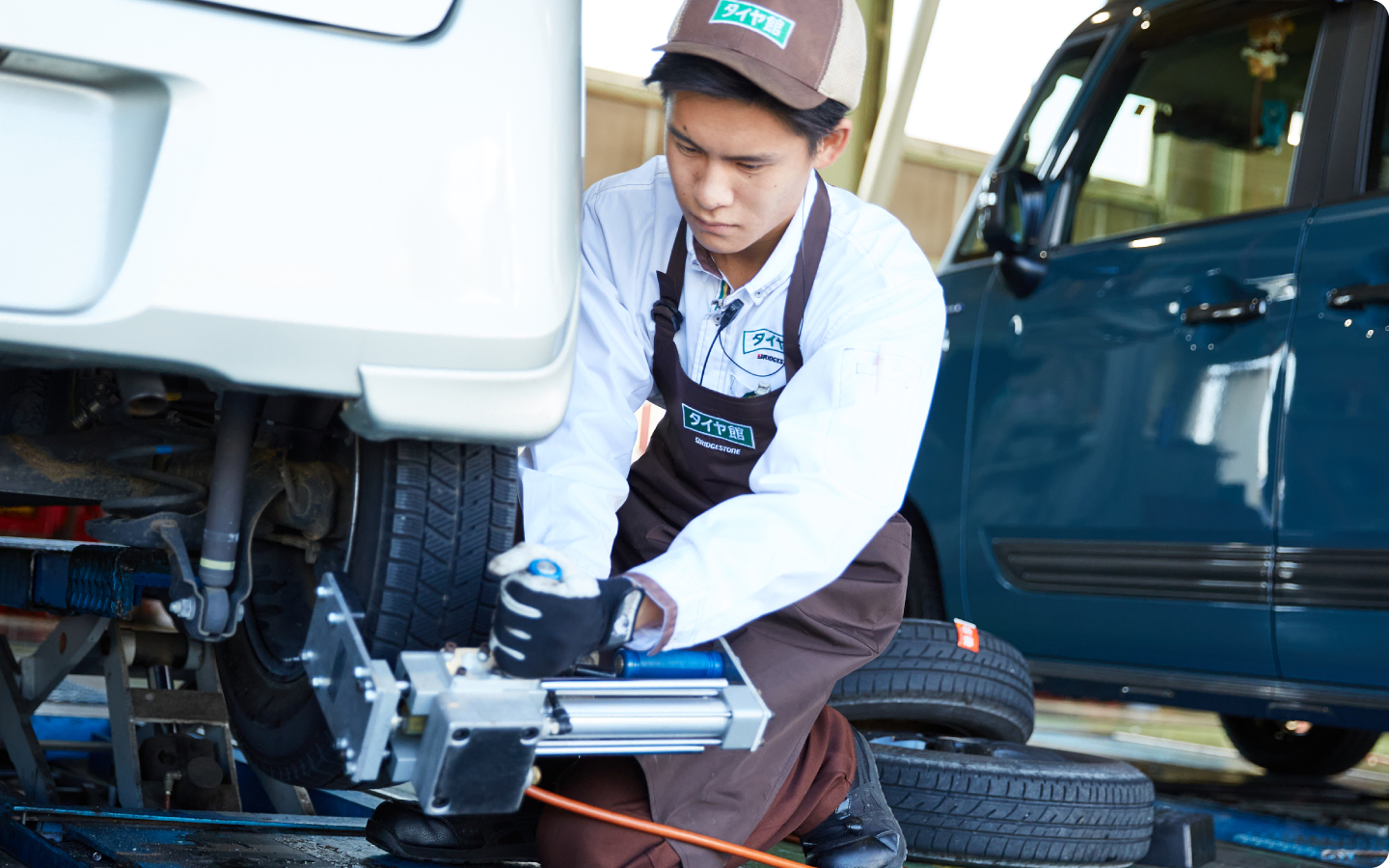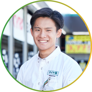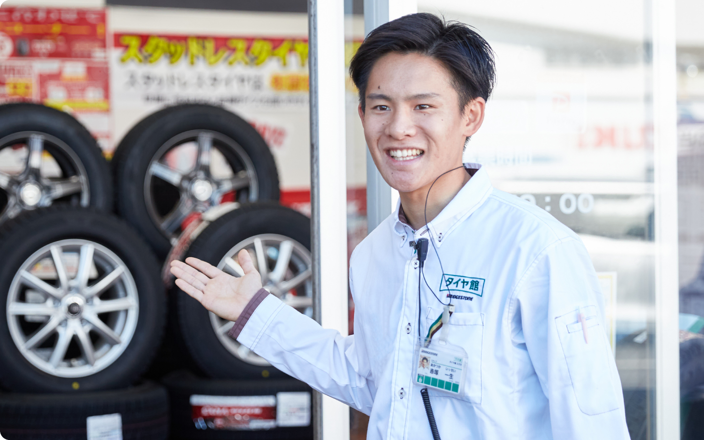 自動車業界を中心に就職活動をしていましたが、点検・メンテナンスから接客まで、こんなに幅広い仕事を経験できるところは他にありませんでした。説明会でタイヤは手のひらと同じ面積の接地面でドライバーと自動車の安全・安心を支えていると聞いて、面白いと感じたことも入社を決めた理由のひとつです。