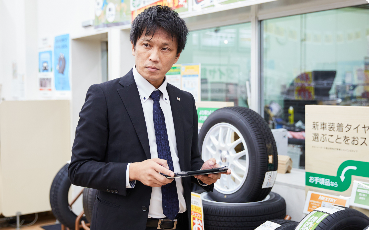 この仕事をしていて一番うれしいのは自分が担当している店舗に、たくさんのお客様が来店してくださることです。それは、スタッフが努力し成長している証であり、お店が目指す理想の形に近づいていることを表しています。昔はとにかくタイヤの販売本数を追求していましたが、今はお客様との接点を広く深くして、来店していただく頻度を増やすことに力を注いでいます。