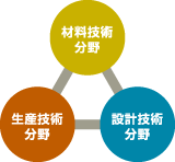 免震ゴムの技術は、材料、設計、生産の3つの分野から成り立っています。それらが相乗効果を生むことによって、高品質・高性能の免震ゴムは実現します。BASEPTに含まれるコア要素技術も、この3つの技術分野に含まれます。
