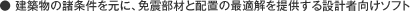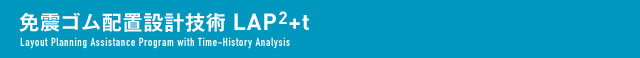 LAP²+tは、建築設計者向けのコンピュータソフトです。柱配置・軸力や地盤条件、上部構造物の剛性・減衰モデルを入力することにより、自動的に製品データベースから免震部材を抽出・配置します。同時に、平成12年建設者告示第2009号に基づく応答解析と、時刻歴解析を即座に実行し、結果を確認。免震部材の配置修正と解析を繰り返して、効率よく適切な解を求めることが可能です。さらに、遺伝的アルゴリズム(GA)による最適化手法を応用することによって、偏心率や免震部材の許容変位等の制約条件を満たしながら、設計者に配置の最適解を自動的に提供します。