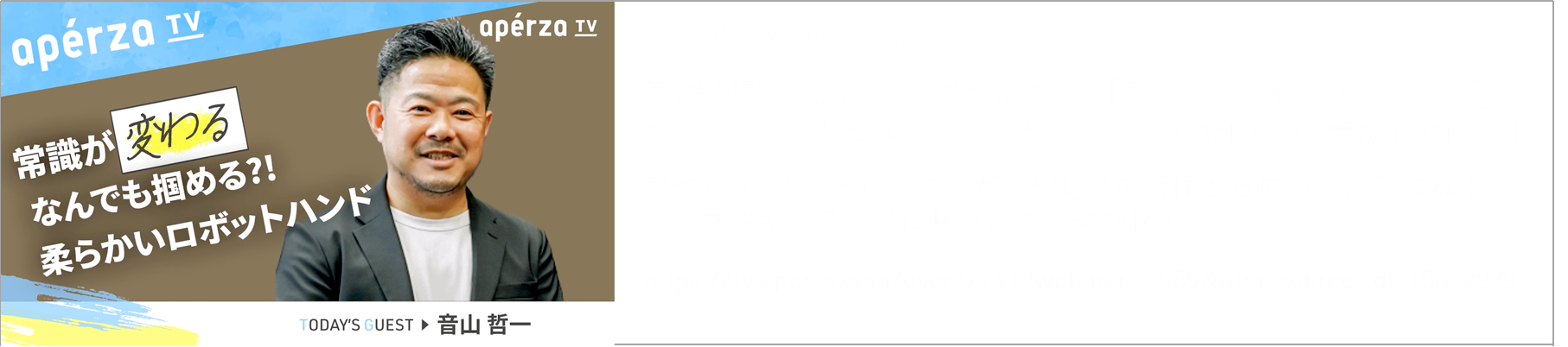 日本のモノづくり技術を特集するインターネットテレビのAperza TVに、ブリヂストン ソフトロボティクス ベンチャーズ CEOの音山が出演いたします。
