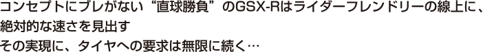 1985年に登場したGSX-R750以来30年余り、“走る・曲がる・止まる”を愚直なまでに追求し続けるスズキのGSX-Rシリーズ。そのトップモデルたるGSX-R1000/Rが、17年モデルとして完全刷新。トップパフォーマーが標準装着(OE)タイヤに選んだのが、ブリヂストンの「RS10」である。