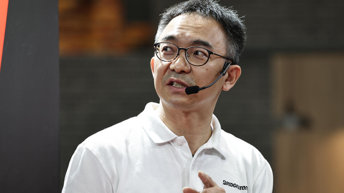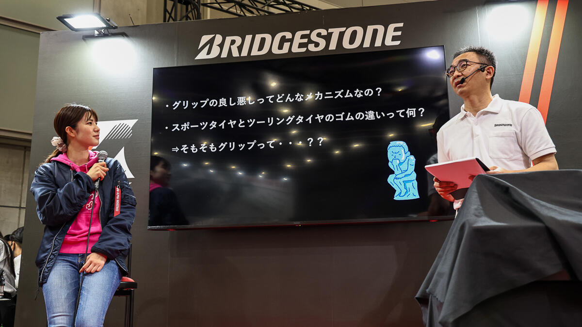 トークショーステージではMCタイヤ設計の原田陽一と中野が登壇。タイヤパタンデザインの役割とタイヤグルービングの重要性について語りました。