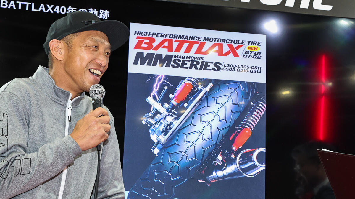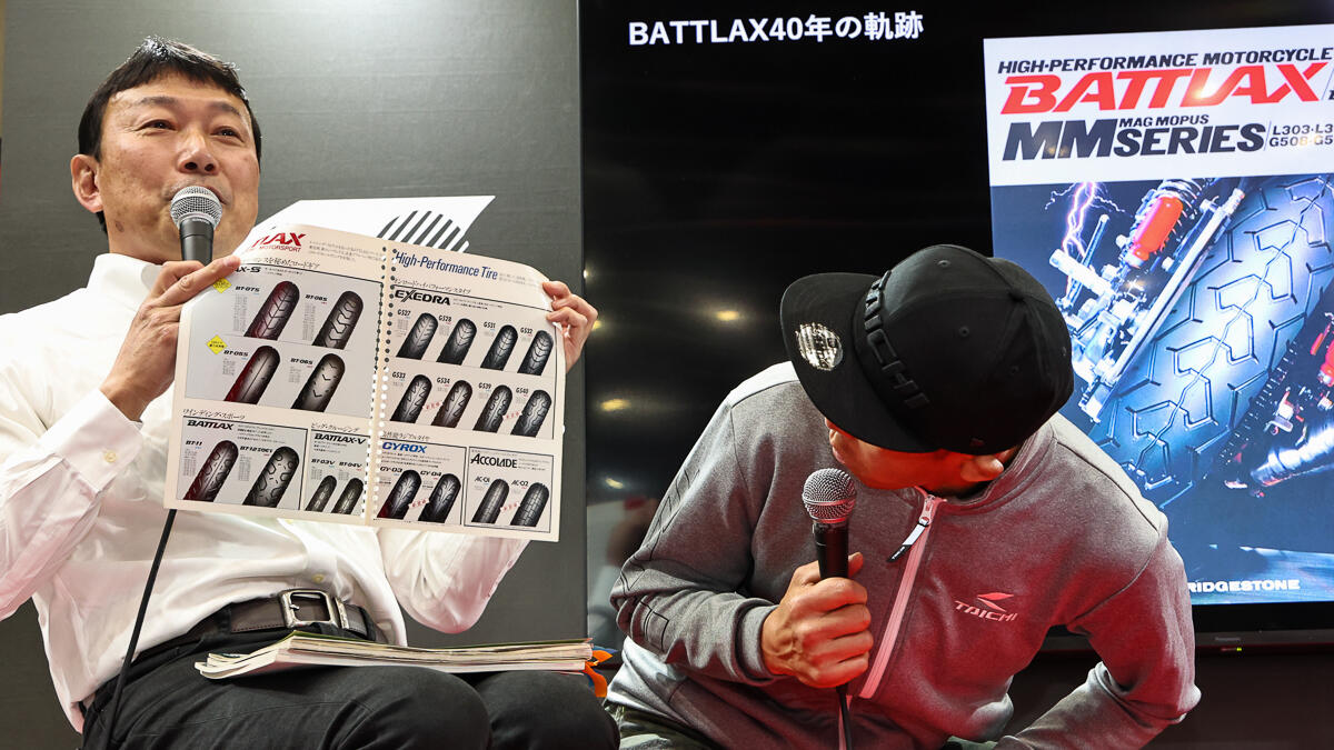 青木宣篤さん、ブリヂストンモーターサイクルタイヤ株式会社佐藤潤によるBATTLAX40年の軌跡を振り返るステージを展開。