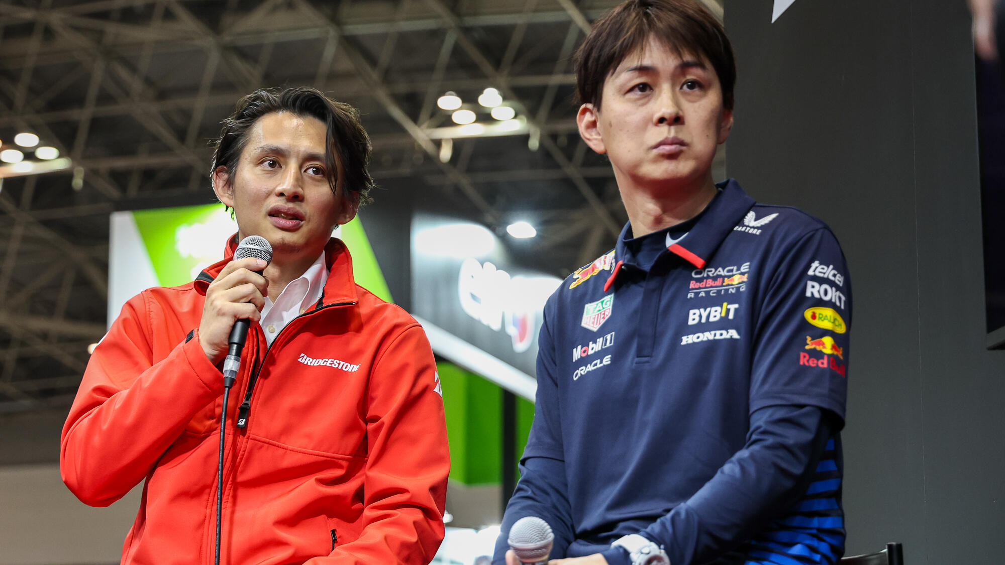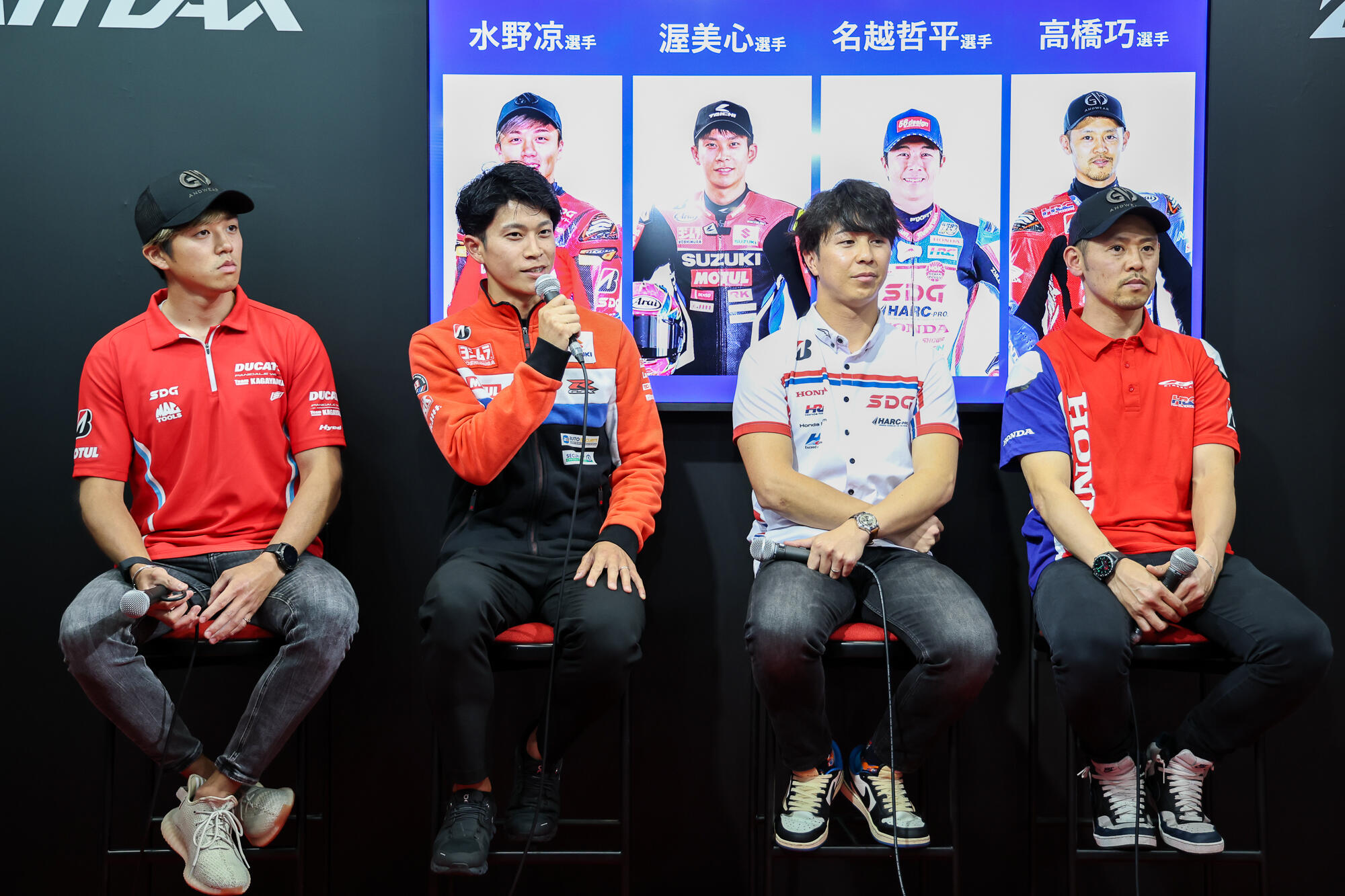 2024年鈴鹿8耐で活躍したライダーが集まったステージ。Team HRC:高橋巧選手、名越哲平選手、YOSHIMURA SERT Motul:渥美心選手、DUCATI Team KAGAYAMA:水野涼選手。メーカーの違うライダーが登壇できるのはブリヂストンならでは。