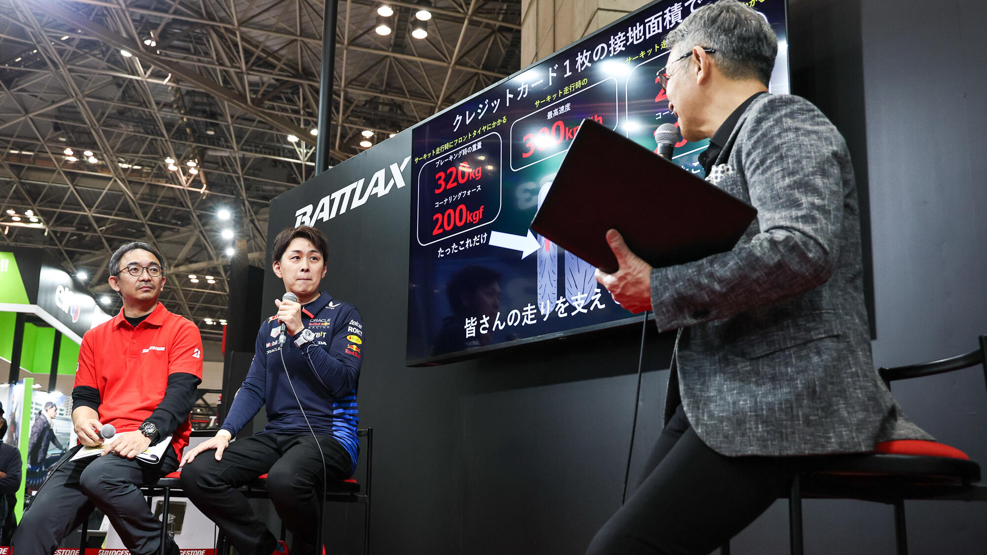 今年は「二輪のプライド」をテーマに、ライダーたちが二輪を操るプライドを再認識・共感できる場所として、2月に発売した新商品「BATTLAX SPORT TOURING T33」や、好評の「BATTLAX HYPERSPORT S23」をはじめとするモーターサイクル用プレミアムタイヤブランド「BATTLAX」の「断トツ性能」をご紹介しました。