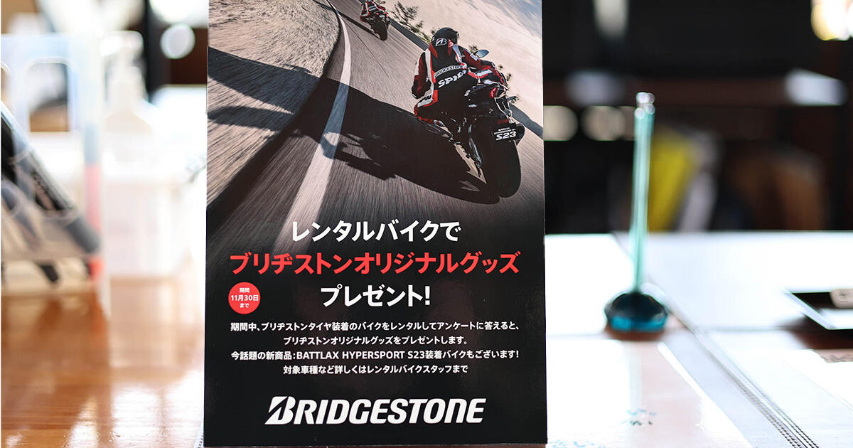 ブリヂストンタイヤ装着のバイクをレンタルしてアンケートにお答えいただいたお客様はもれなくオリジナルグッズをプレゼントいたします。