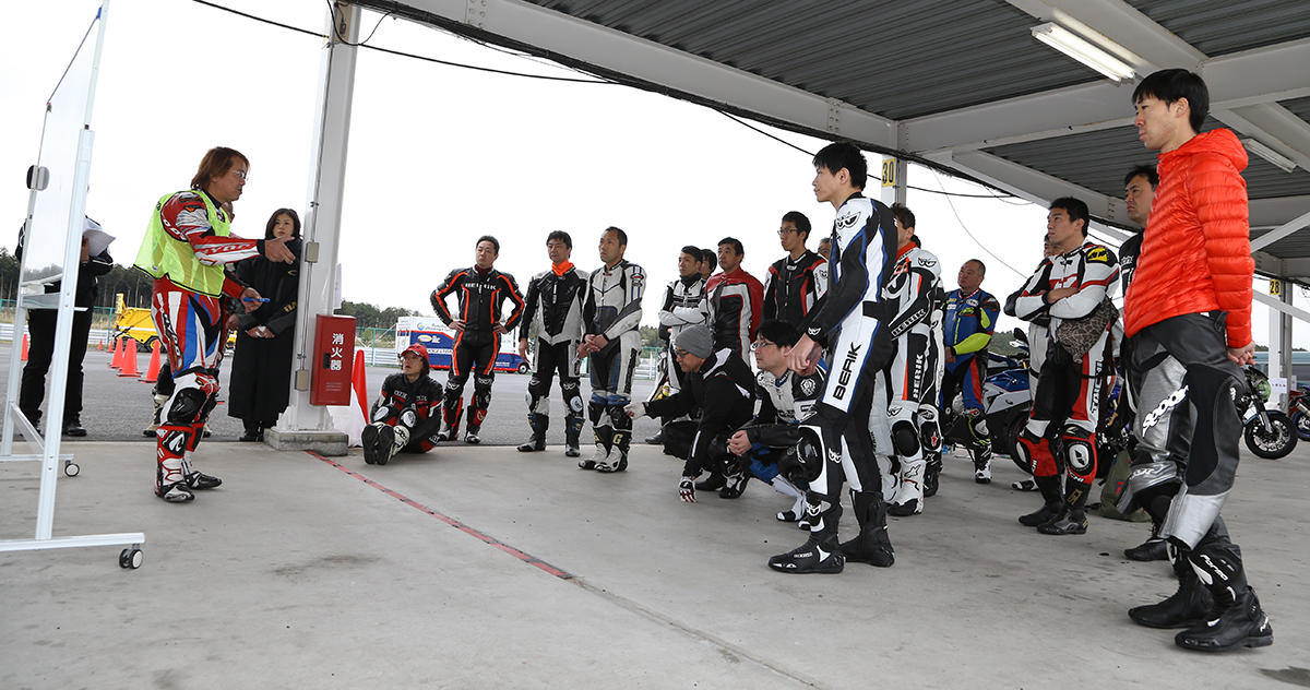 今回の走行会で司会・進行を務めた元全米選手権チャンピオンの宮城光さん、そしてスペシャルゲストとして参加した全日本ロードレース選手権4年連続チャンピオンの中須賀克行選手がフリー走行クラスのレッスンを強力サポートしました。しかも、路面が乾いてきた午後には、二人そろって参加者とともにコースを周回するという行動に。いっしょに走った参加者たちは、その異次元のスピード、ブレーキング、コーナリングを身近に感じながら、最高の学びをものにすることができました。