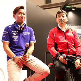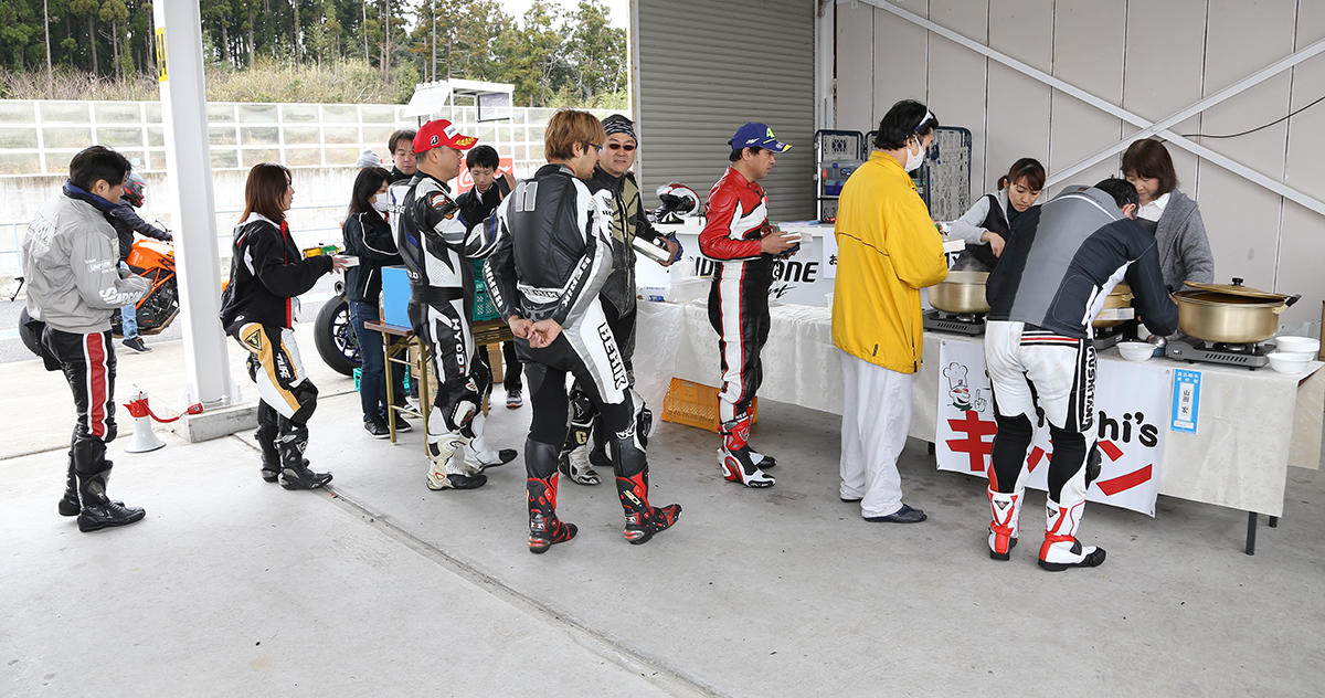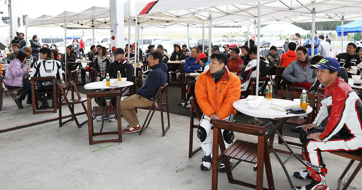 昼食時には、二輪モータースポーツ全般を司る山田宏を交えてトークショーが開催されました。そこでは、レースにおけるブリヂストンタイヤの優位性と、ブリヂストンの最新技術「ULTIMAT EYE(アルティメットアイ)™」を採用して開発されたBATTLAX HYPERSPORT S21の「グリップ力の高さ」「ライフの長さ」などについて語られ、BATLLAXを愛好する参加者たちを大いに満足させました。なお、トークショー中にふるまわれた鶏の出汁を活かした豚汁は山田宏の監修メニュー。とにかく美味で、参加者全員の心を掴むグリップ力の高さを発揮していました(