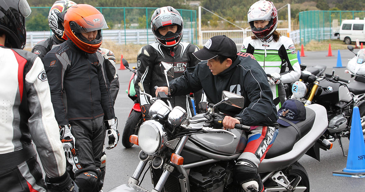 フリー走行クラスのレッスンは国際ライダーの戸田隆選手と全日本選手権に参戦中の関口太郎選手というトップライダーが担当。ビギナー&レディースクラスのレッスンも日本人女性としてはじめて世界GPにフル出場した経歴をもつ実力派講師:井形ともさんが担当しました。今回のレッスンのメインテーマはブレーキングでしたが、どのクラスでもトップレベルの極意がわかりやすい形で伝授され、参加者たちはメキメキと上達していました。