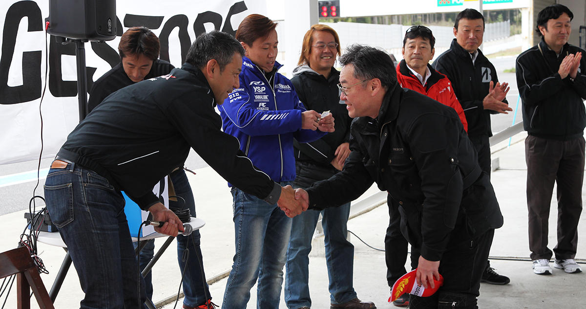 閉会式では抽選会が行われ、当選者に宮城光さんと中須賀克行選手両名のサインが入ったレーシングキャップがプレゼントされました。ときどき宮城さんが「本当は中須賀選手のキャップがほしいんでしょうけど、僕のが当たってゴメンなさいね」とジョークを飛ばしながら手渡すなか、「いや、宮城さんのだから嬉しいんです」と真顔で答える当選者がいるなど、最後までいいムード。多くの参加者が「また参加します」との明るい声を残して帰路につきました。