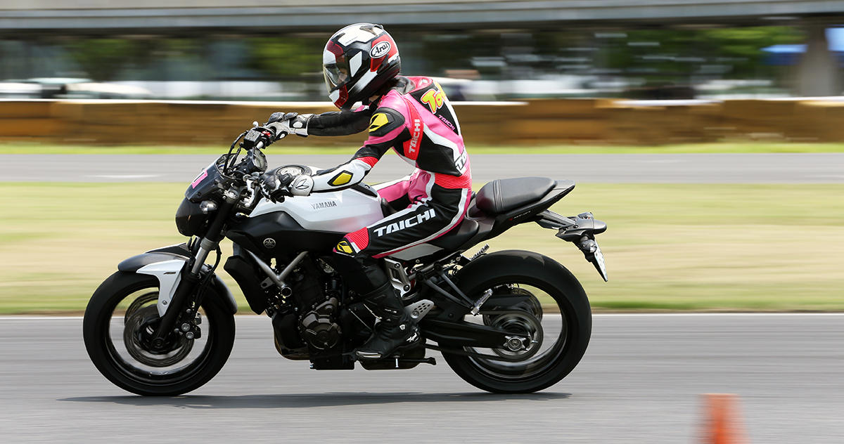 午後のサーキット走行は各クラスとも1本ずつ行われました。 フリー走行クラスの参加者たちは、午前中に体得したサーキットでのブレーキングやコーナリングのポイントを確かめながら、よりスムースかつスピーディな走りに挑んでいました。 ビギナー&レディースも特設コースで午前の復習を行ったあとコースイン。午前中のおっかなびっくりのガチガチの走りは影を潜め、肩のチカラが抜けたきれいな走りが目立つようになっていました。