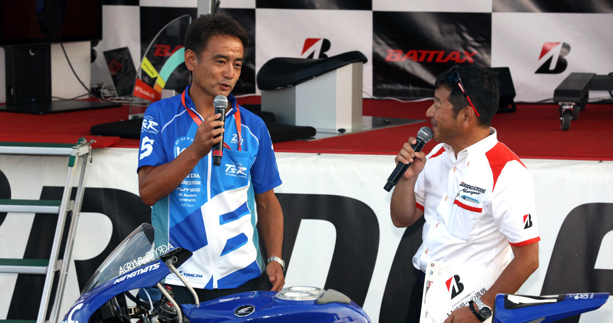 30日(土)の最後に行われたのが、F.C.C. TSR Hondaの藤井総監督をお迎えして、2011年、2012年の鈴鹿8耐で優勝を飾ったマシンを目の前に、ブリヂストンモータースポーツの山田宏が徹底解剖するステージです。