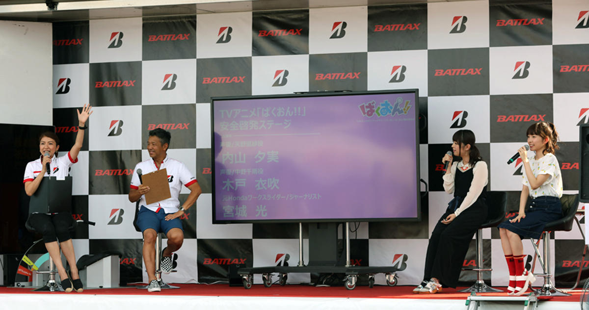 写真左から、今回のブリヂストンブースでMCを務めて頂きました佐藤恵さん、司会の宮城光さん、天野恩紗役の内山夕実さん、中野千雨役の木戸衣吹さん。