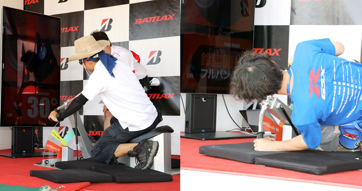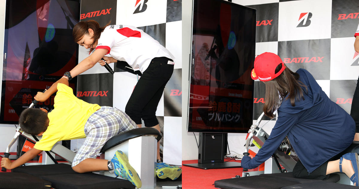 男性はもちろん、女性やお子様まで多くのお客様に、鈴鹿8耐のフルバンク体験や、バンク角による接地面の移動や変化の様子を視覚的にも体験して頂きました。