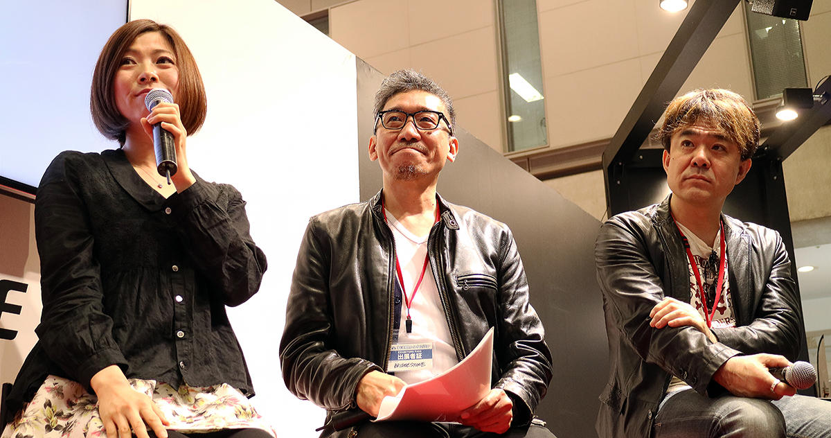 「走り続けるキミが好き」の主役・中上サツキさん、2015年鈴鹿8時間耐久ロードレース:スーパーストッククラス優勝「team R1 YAMALUBE」の時永真さん、バイクレースファンなら誰でも知っている伝説のチャンピオン:藤原儀彦さんが登壇。