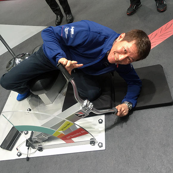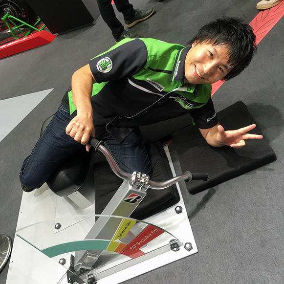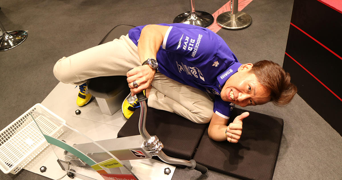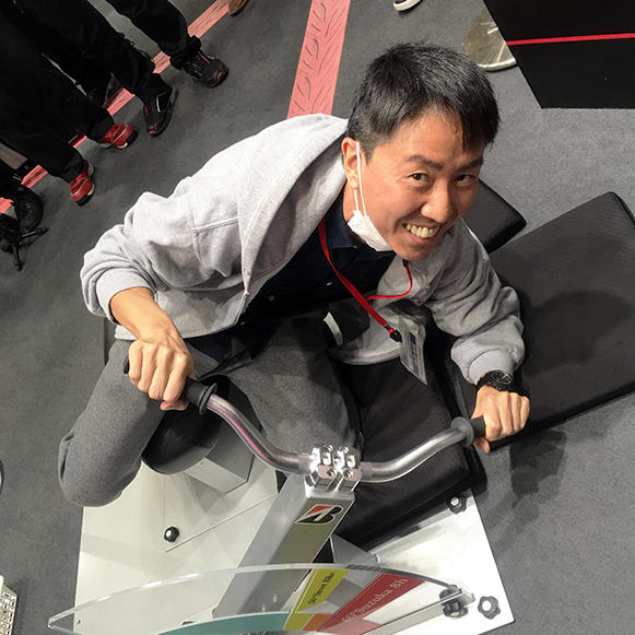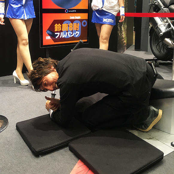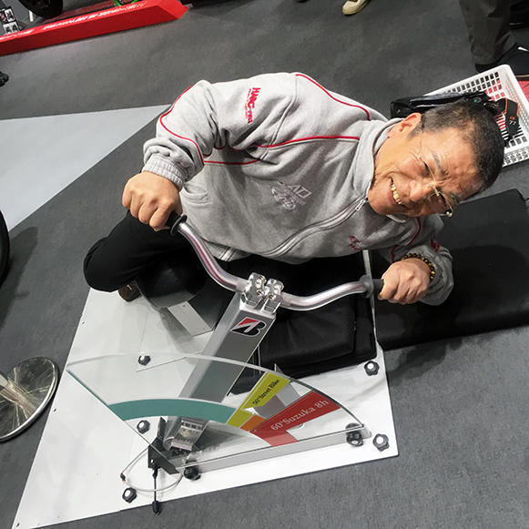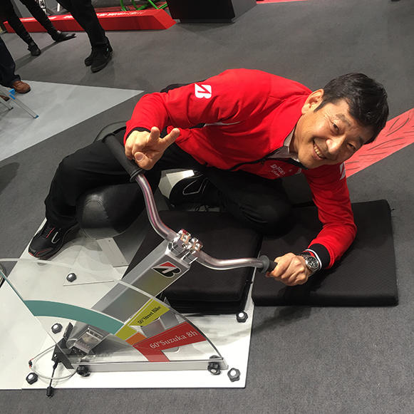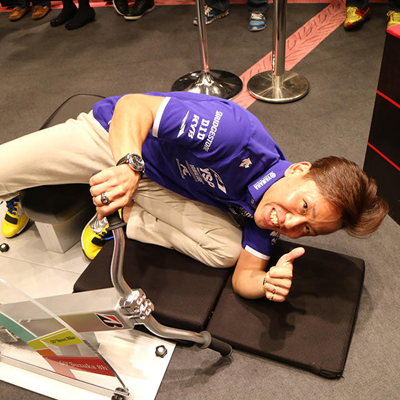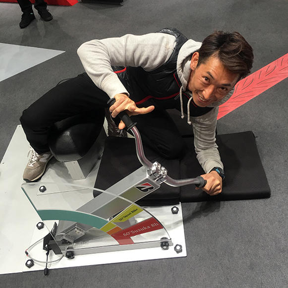もちろんブリヂストンの山田宏も体験。笑顔ですが実は相当キツイ体勢を我慢しています