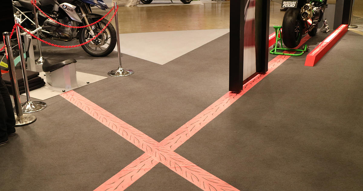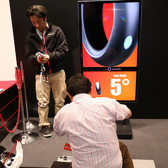 まずは商品展示。今回、ブリヂストンブースを大きく4つのゾーンに分けました。新商品「BATTLAX HYPERSPORT S21」を展示した"SPORT"ゾーン、「BATTLAX RACING STREET RS10」を展示した"RACE" ゾーン、「BATTLAX SPORT TOURING T30 EVO」を展示した"TOURING" ゾーン、「BATTLAX ADVENTURE A40」を展示した"ADVENTURE" ゾーンです。それぞれの世界観を創出するビジュアルとバイクを展示しました。