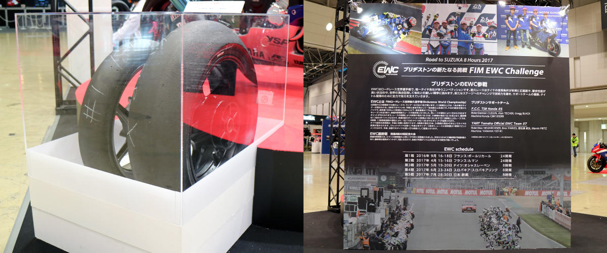 中須賀選手がテスト走行を行ったプロトタイプタイヤ(左)と、EWC紹介パネル(右)。