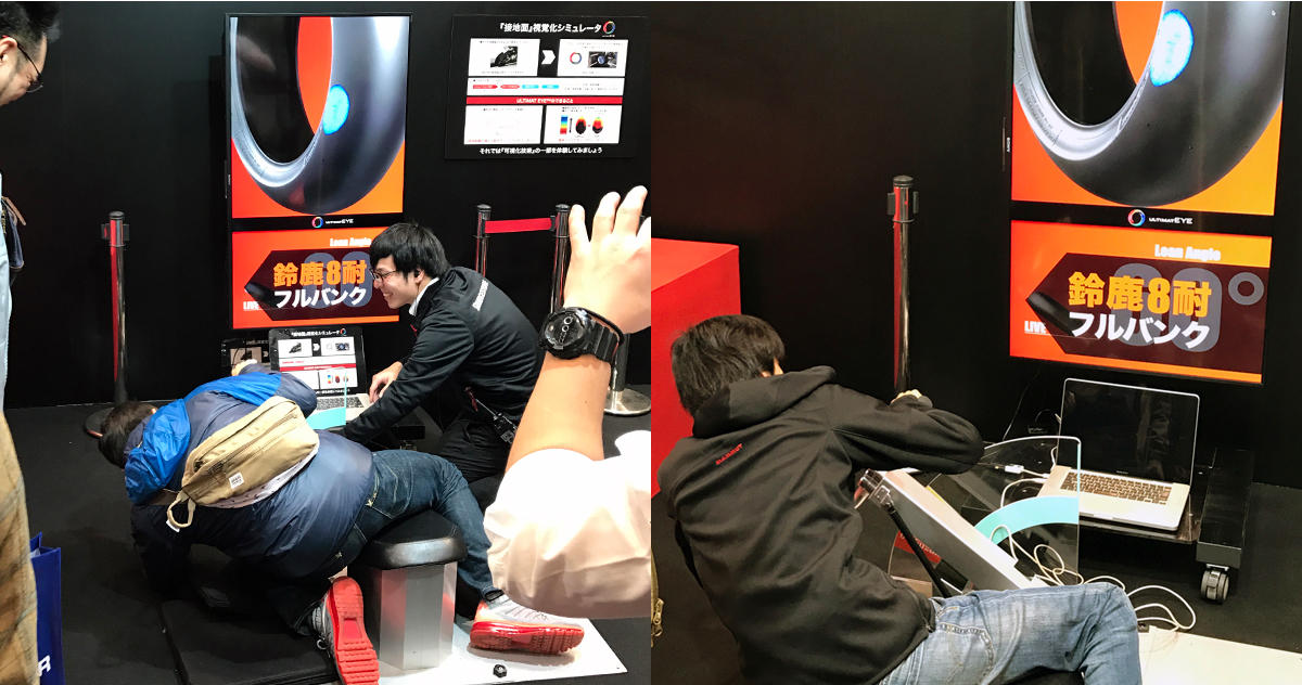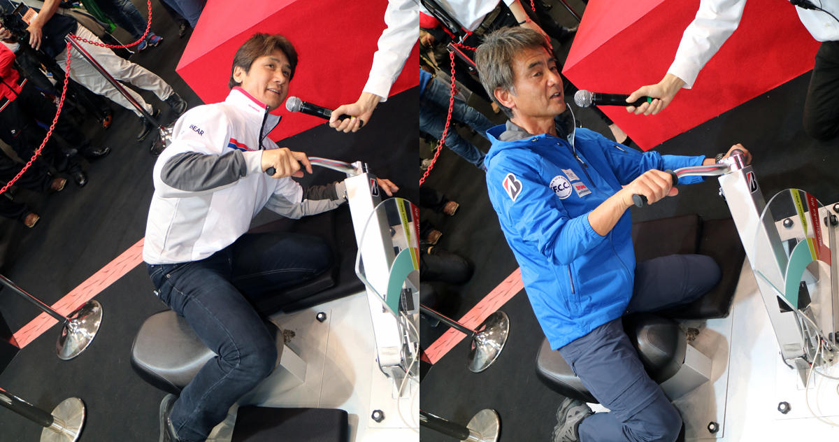 ステージイベントにご登壇頂いた皆さまにも体験頂きました!こちらはMuSASHi RT HARC-PRO.の高橋巧選手(左)と、Team GREENの渡辺一馬選手(右)。