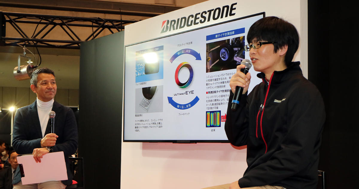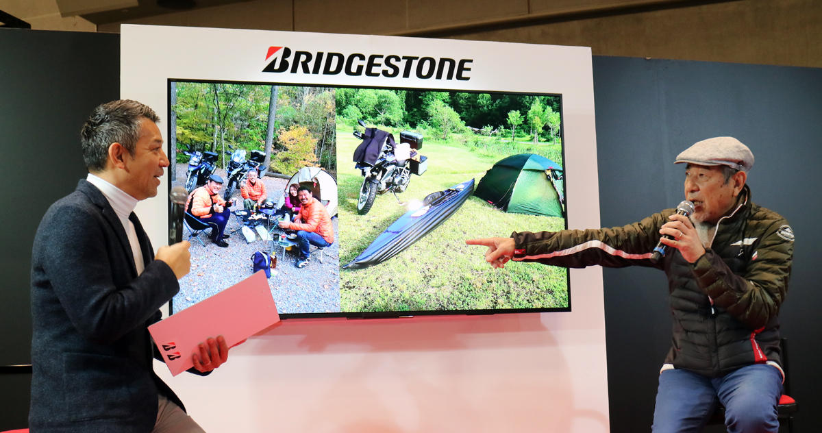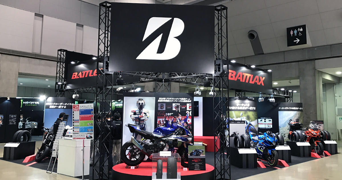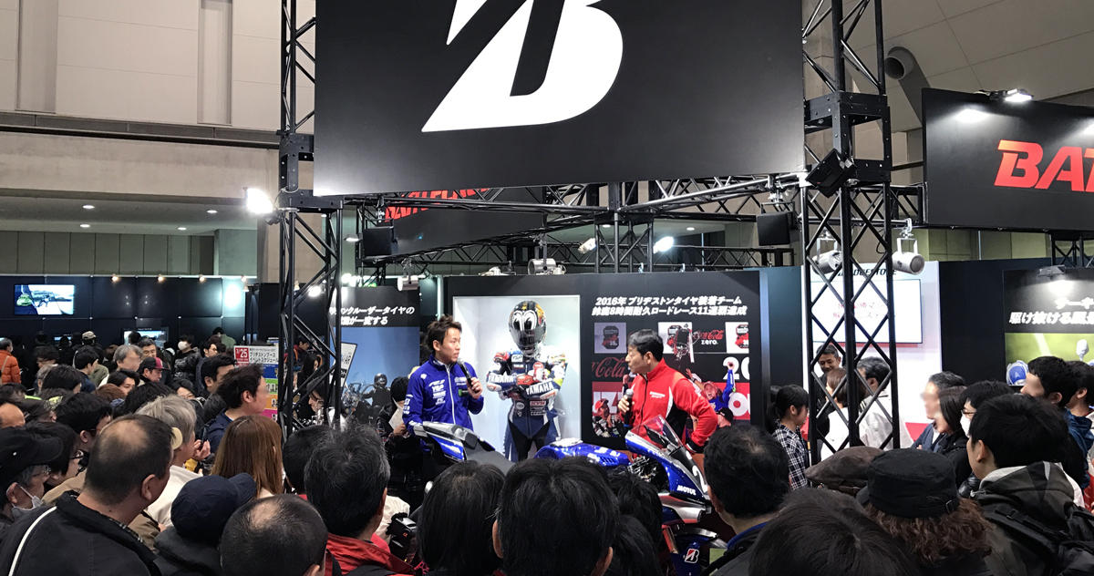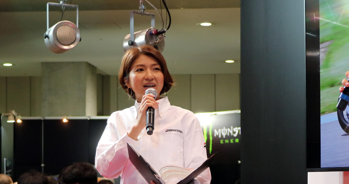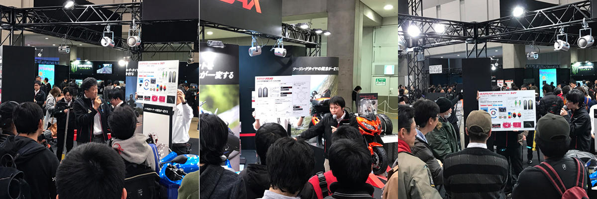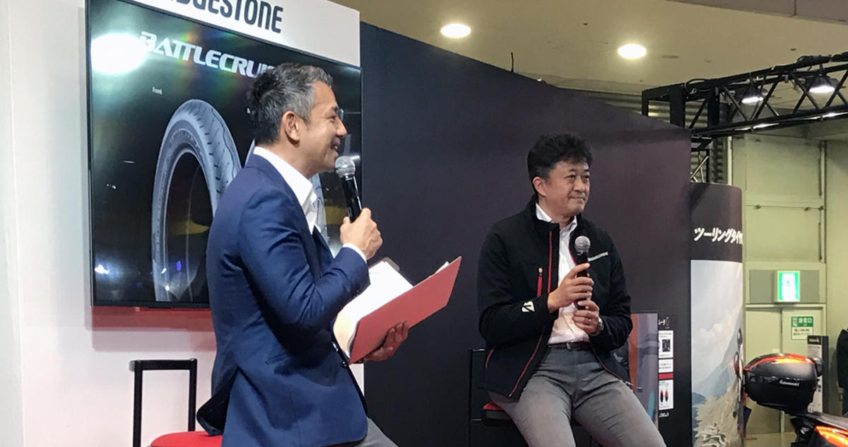 商品プレゼンテーションステージでは、今年発売しましたアメリカンVツインクルーザー向けタイヤ「BATTLECRUISE H50」を始め、「BATTLAX RACING STREET RS10」と「BATTLAX HYPERSPORT S21」について、宮城光さんとブリヂストンMCタイヤ開発部の開発担当者との掛け合いにてご説明をさせて頂きました。