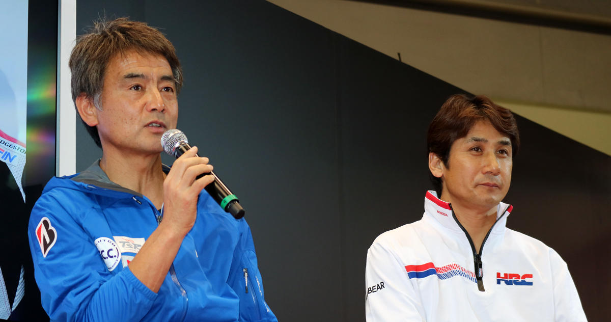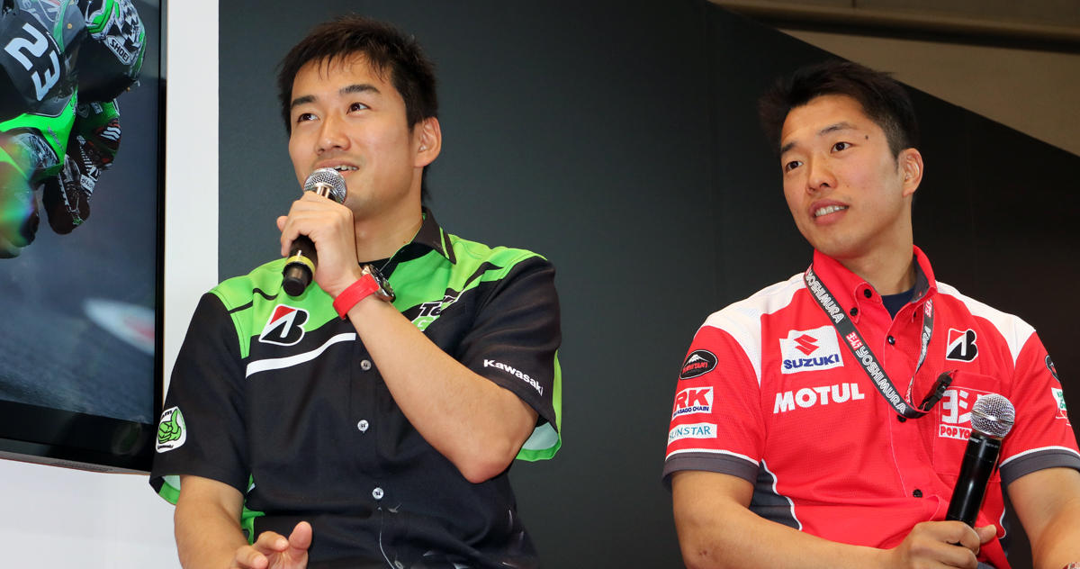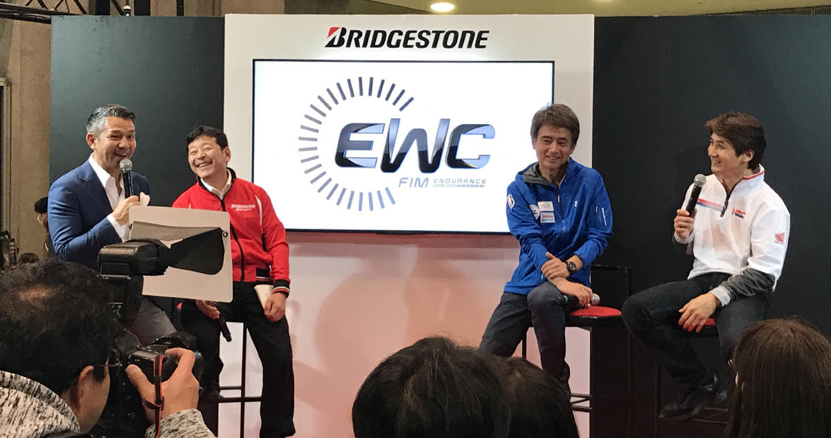 24日(金)の最後のステージでは、「FIM世界耐久選手権シリーズ(以下、EWC)」に参戦する「F.C.C. TSR Honda」の藤井正和監督と、伊藤真一選手をお招きし、EWCにタイヤサプライヤーとして参戦するブリヂストンからは山田宏を加え、EWCの厳しい戦いや、今年から最終戦となる鈴鹿8耐への思いについてお話し頂きました。